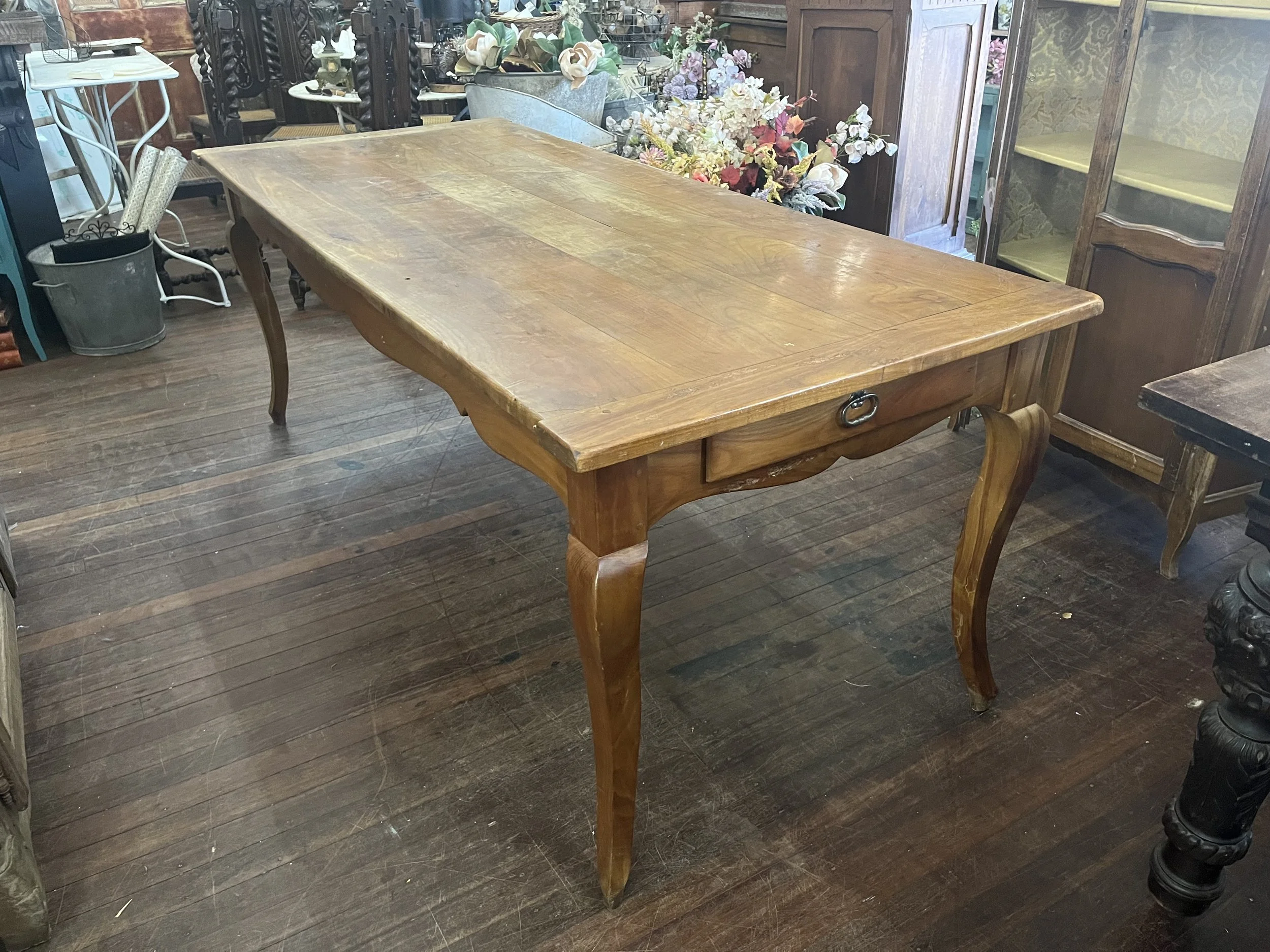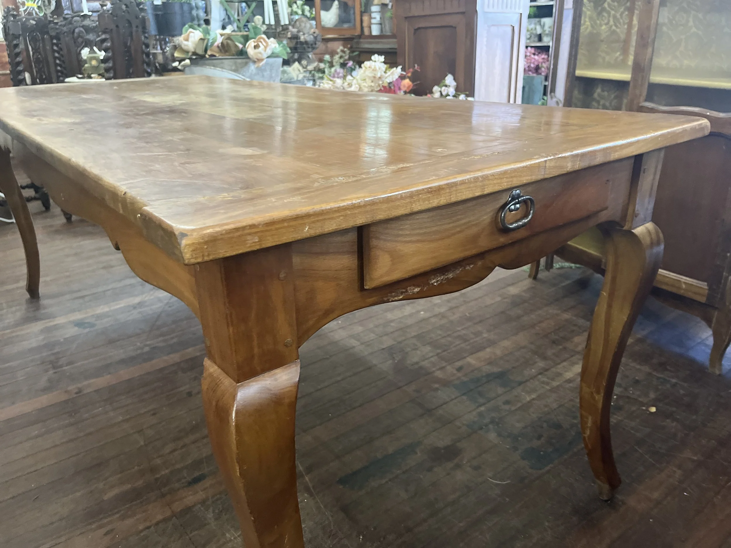 A true classic French Provincial dining table, this piece is from the early 1900’s and is made from cherry wood. It features a character carved apron and stunning cabriole legs. There is also one singular draw with a lovely iron handle.